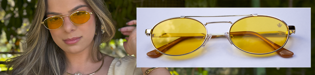 Seu visual marcante com armação dourada e lentes amarelas vibrantes transforma qualquer look, trazendo um toque de autenticidade e sofisticação para quem quer se destacar.